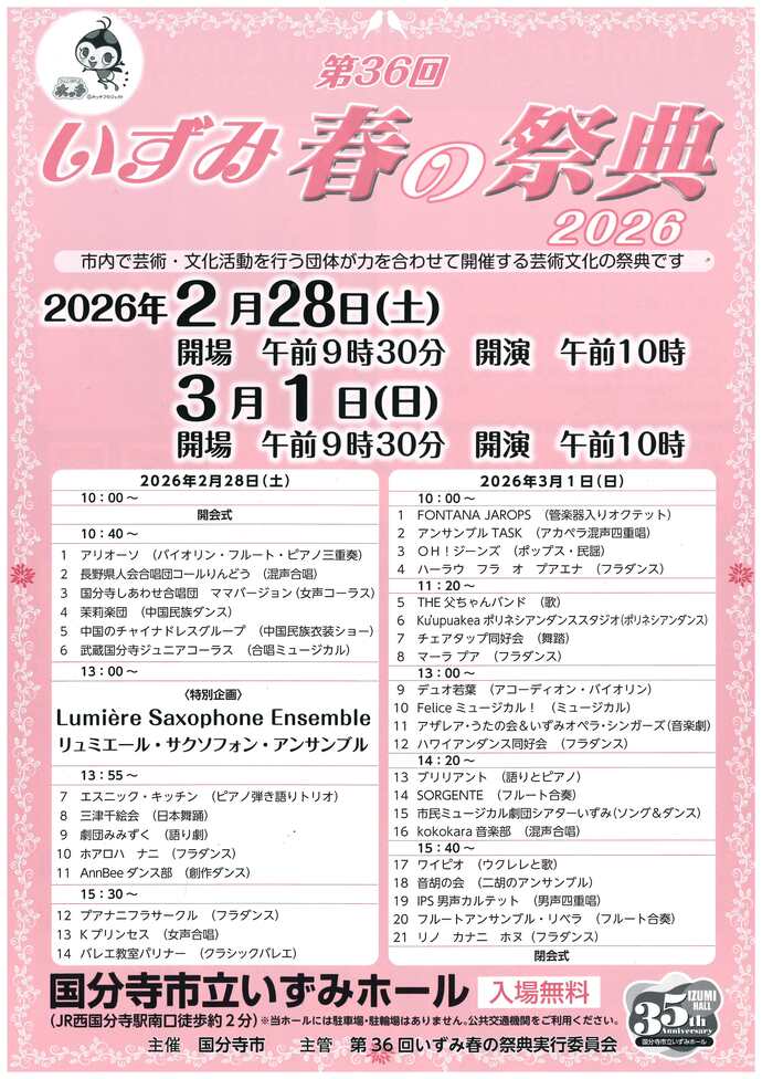 毎年、いずみホールにて2日間開催される「いずみ春の祭典」に、今年もバレエ教室パリナーとして参加させていただきます。出演日時は、2月28日土曜日の16:00ごろを予定しております。お時間、ご興味のある方は、ぜひ足をお運びください。お待ちしてます。
